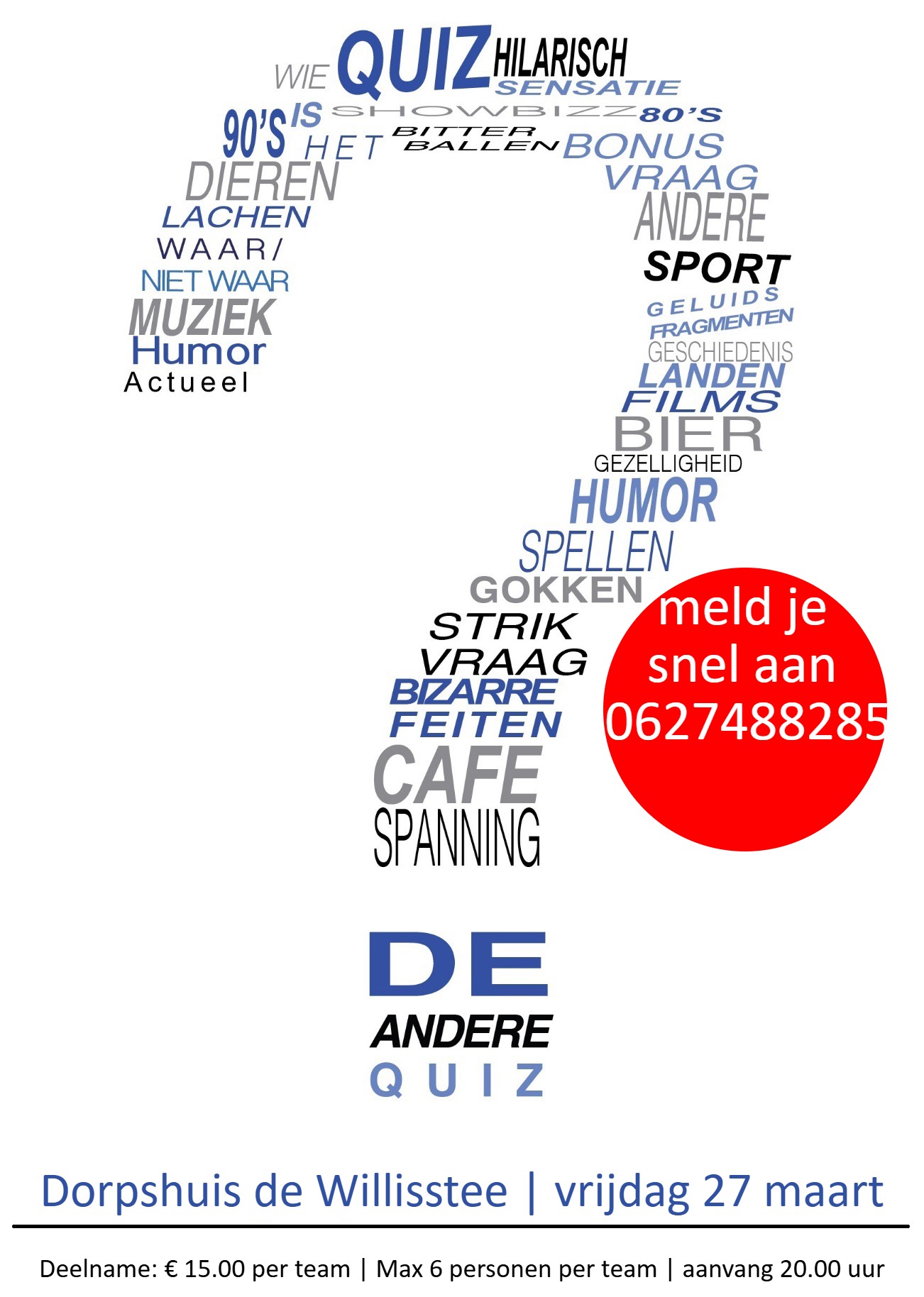 Op vrijdag 27 maart is het weer tijd voor een gezellige pubquiz in De Willisstee in Wilnis. Trommel je team bij elkaar (maximaal 6 personen) en ga de uitdaging aan! 💶 Kosten: €15,00 per team ⏰ Start: 20.00 uur 👉 Meld je snel aan, want vol = vol! Een avond vol gezelligheid, vragen en plezier gegarandeerd.